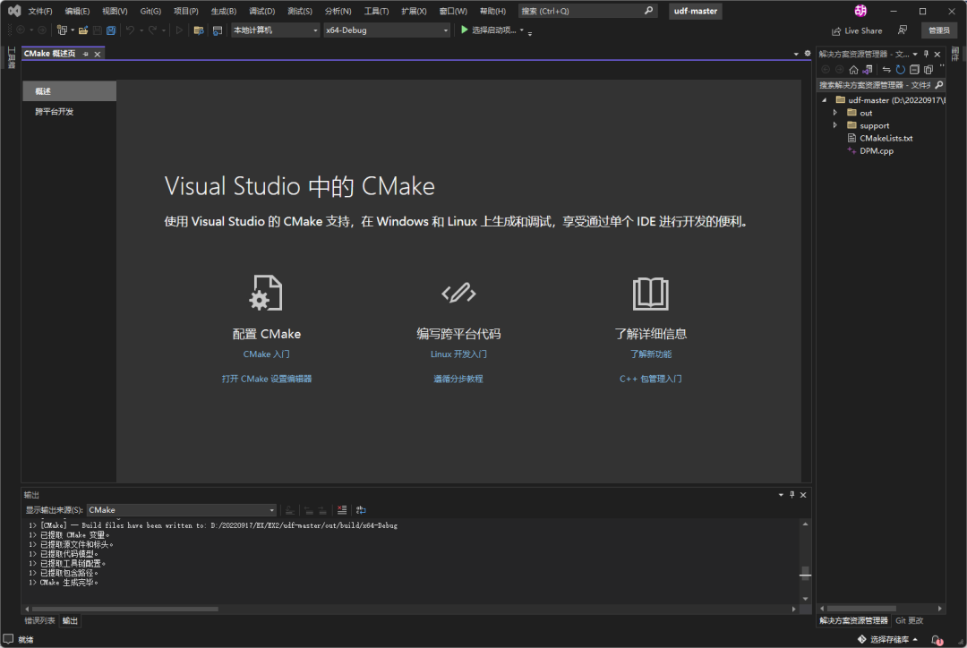 若Visual Studio安装时选择了CMake工具,则此时应该是这样的。不同的VS版本可能会略有差异,下图是本机安装的VS 2022显示的结果。