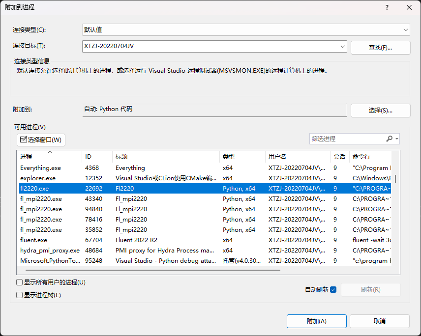 对话框中找到Fluent进程,如下图所示的 fl2220.exe,点击附加按钮