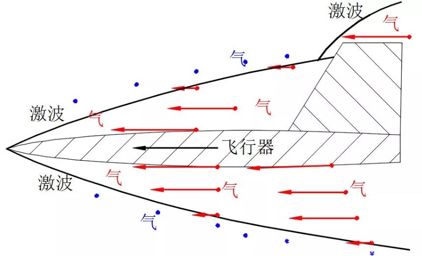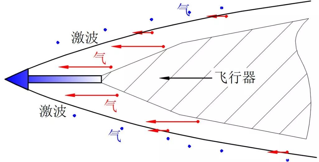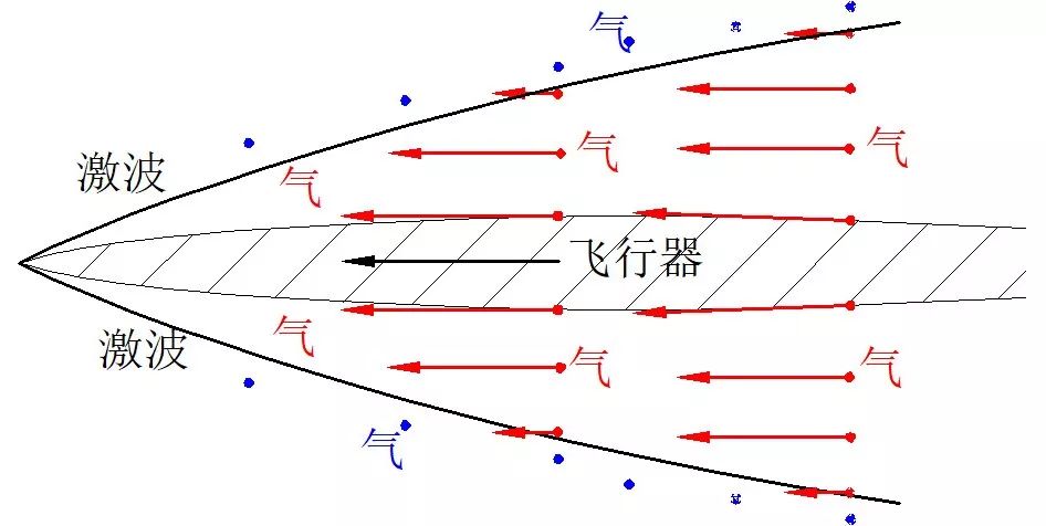 飞行器不断“撞击”前方静止的空气。激波的前面是没有被飞行器撞击的空气,激波的后面是被撞击的空气。激波就是划分被撞击到的和还没有被撞到的界面。