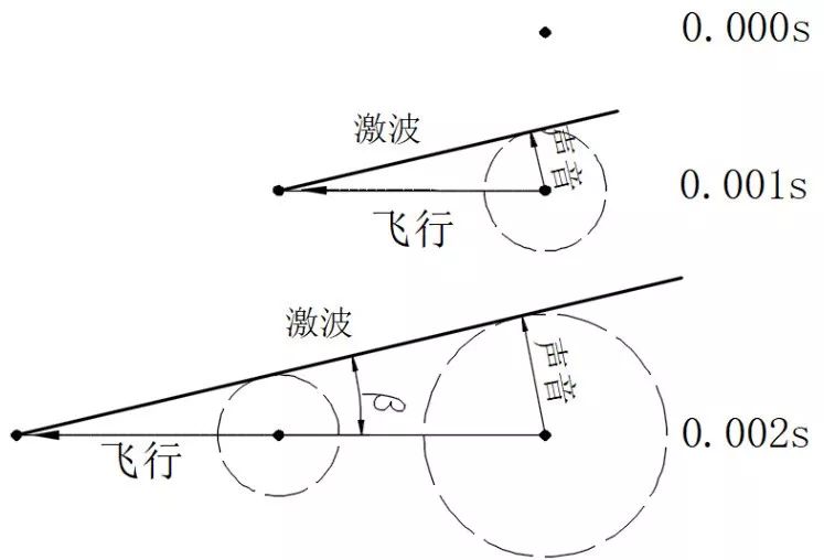 激波的角度β(马赫锥半角),tg(β)=音速/飞行速度,飞得越快,激波越尖。