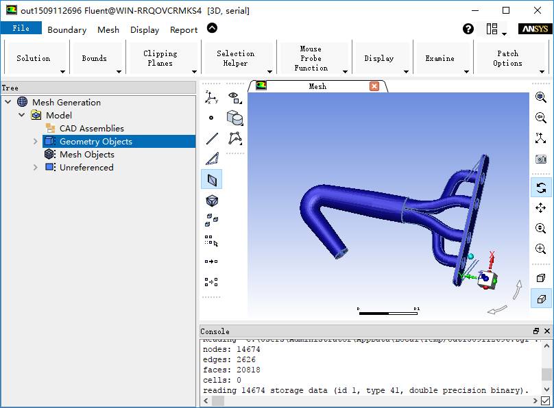Fluent Meshing的工作界面与Fluent相同,也包含模型树、图形显示窗口以及TUI窗口。如下图所示。