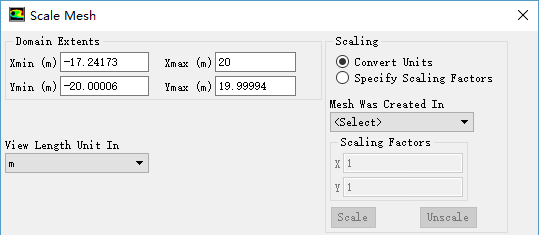 Scale Mesh 对话框显示出整个计算域的尺寸,如图所示,模型的 X 方向尺寸约为 37.2m , Y 方向尺寸约为 40m ,符合实际几何要求,因此不需要进行模型缩放。