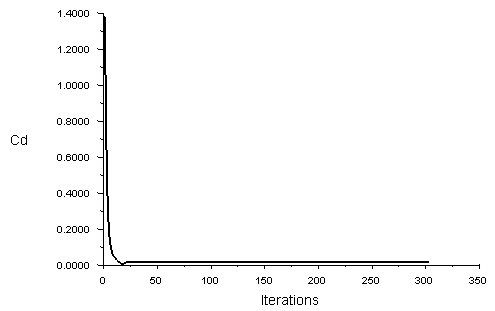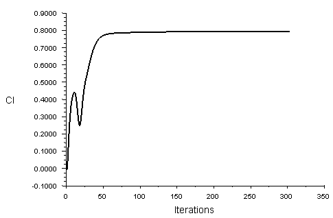升力系数及阻力系数监测曲线如图所示。从两图可以看出,经过约 100 次迭代后,升力系数Cl与阻力系数Cd基本达到稳定。从 TUI 窗口可以看出计算得到的升力系数为 0.7937 ,阻力系数为 0.01691 。