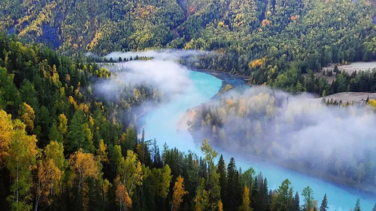 月亮湾的晨雾 — 水的微粒在河谷漂浮