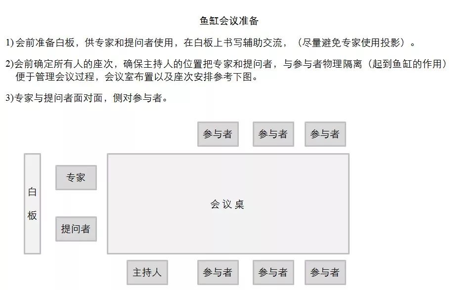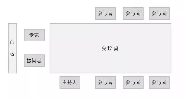 2)会前确定所有人的座次,确保主持人的位置把专家和提问者,与参与者物理隔离(起到鱼缸的作用)便于会议过程的管理,会议室布置以及座次安排参考下图。
