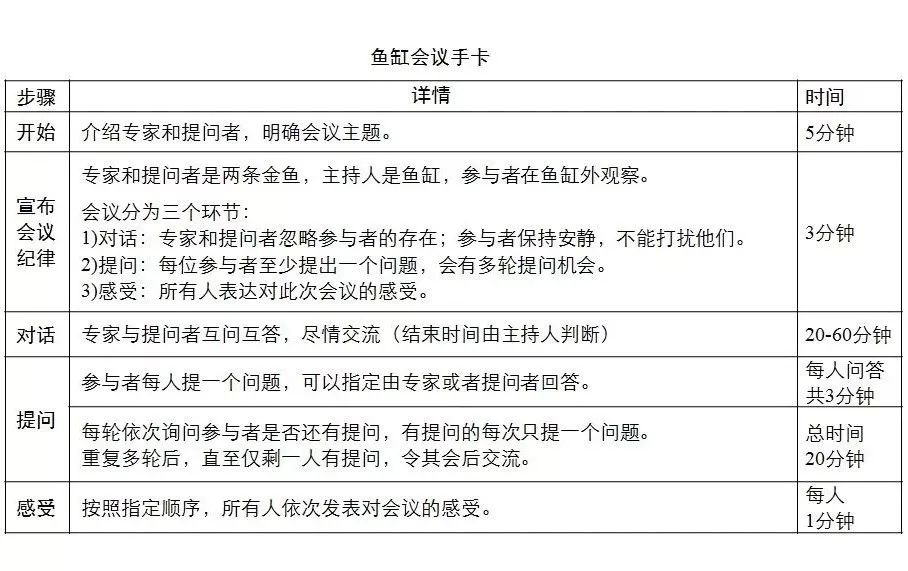 对话可以提前结束吗?如果对话没到20分钟就没得谈了,可以提前结束,进入提问环节。提问环节后,如果时间很多,可以重新启动对话,再开一遍鱼缸会议。也许被参与者的思想冲击后,专家和提问者有了对话的新思路。