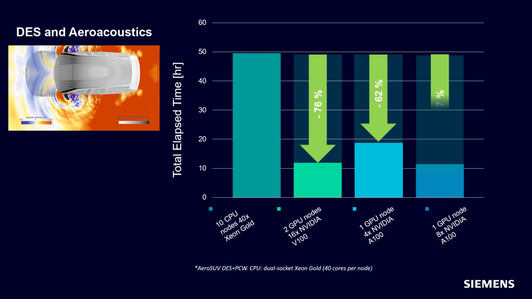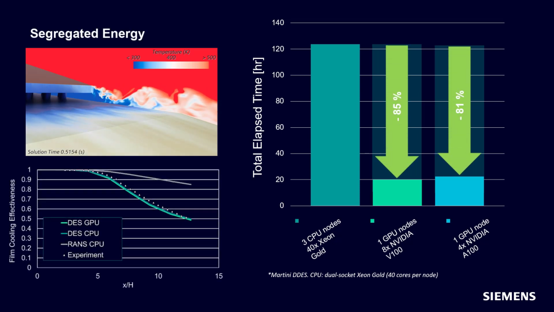 从这个图来看,加速能力很强大。不过不清楚拿来做对比的CPU是什么水平,没仔细听视频,不清楚交代了没有。看着像是10节点,每个节点包括双路40核心的至强金牌CPU,不知道CPU具体啥型号。与之对比的分别是2个16路Tesla V100节点、1个4路Tesla A100节点以及1个8路Tesla A100节点。(我滴个乖乖,啥时候我也能用上这配置啊,想想都流口水~),看着加速效果杠杠的。