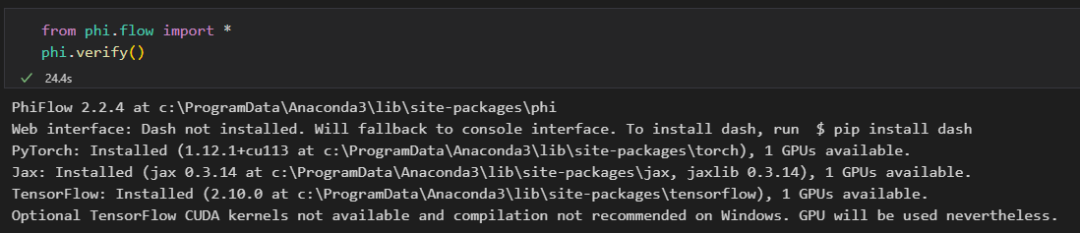 除PhiFlow之外,若要启用机器学习功能及GPU计算,还需要安装PyTorch、TensorFlow或Jax。