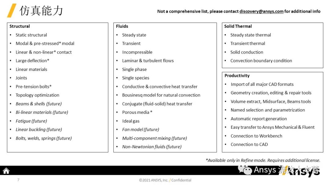 Discovery产品的囊括了几何建模及清理,静力学,模态,流体(内流及外流),温升以及拓扑优化分析功能。