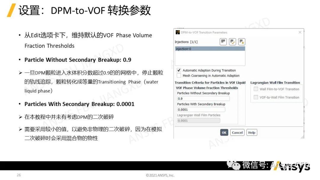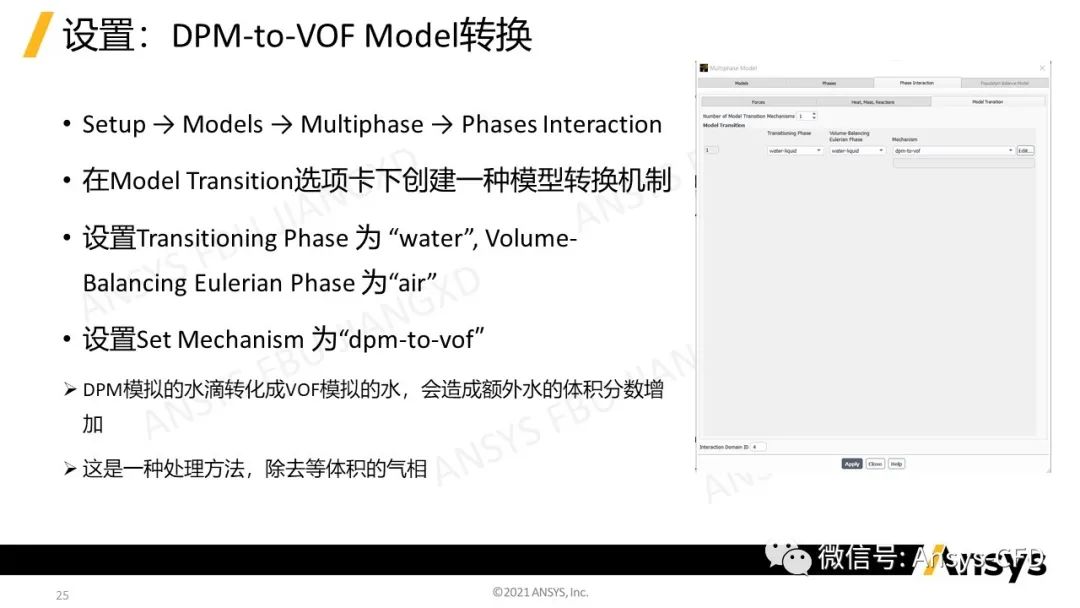 Ø当DPM颗粒撞击到液体表面时,采用DPM-to-VOF模型过渡工具将DPM颗粒转化成液体