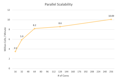而在另外一个测试中,在256核机器上,Mosaic poly-hexcore技术生成速率超过了一分钟一千万网格。