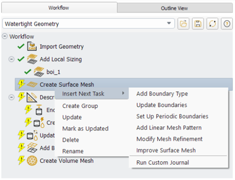 在使用Fluent WTM流程时,每当完成一个任务,Fluent Meshing会自动生成一个绿色对勾。已经完成的任务也可以被改善,例如,当面网格质量最大扭曲度大于0.7时,Fluent meshing会生成一个绿色对勾,但在上面会一个绿色星标,右击它则允许客户插入新的任务,以进行相应的修改。