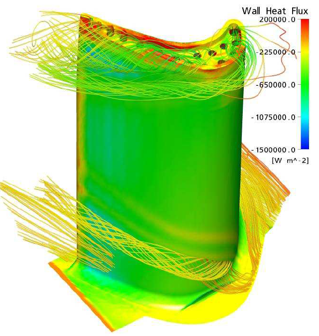 左图:气冷涡轮表面冷气流线图及换热量云图