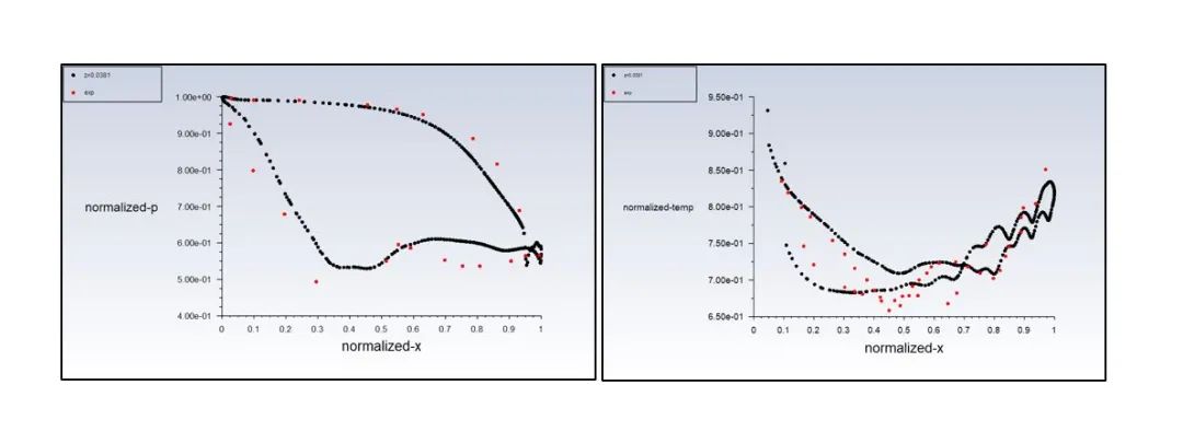 NASA C3X气冷涡轮叶片表面压力系数曲线(左)和温度曲线与试验数据的比对