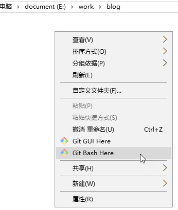 进入blog文件夹,右键点击空白处,选择菜单Git Bash Here
