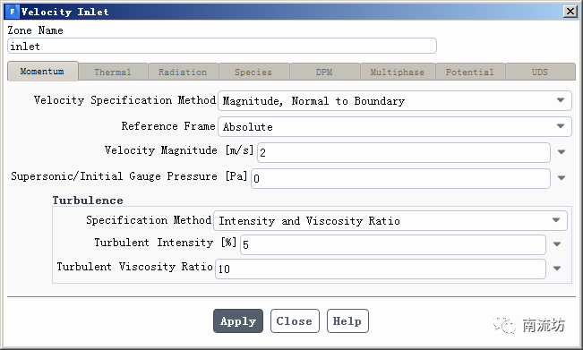 (2)在边界条件面板中,选择inlet,Velocity Magnitude输入2,单击OK按钮确认退出。
