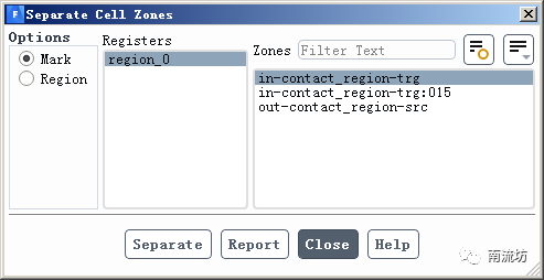 (2)单击主菜单中Domain→Zones→Separate→Cells按钮,弹出Separate Cell Zones对话框,options选择Mark,Registers选择步骤(1)设置的监测点,Zones选择监测点所在的计算域,单击Separate按钮。
