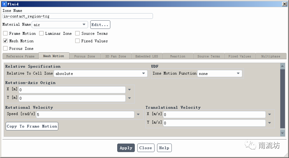 (3)设置Cell zone condition中的in-contact_region-trg。勾选Mesh Motion,Rotational Velocity输入5,单击OK按钮确认退出。