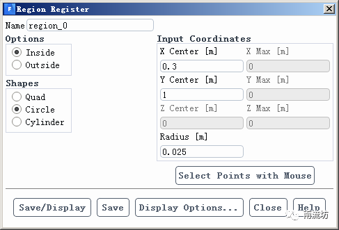 (1)单击主菜单中Domain→Adapt→Refine按钮,弹出Adaption Controls对话框,单击Cell Registers→New→Region按钮,弹出Region Register对话框,设置监测点位置。