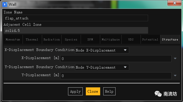 (1)在边界条件面板中,双击flap_attach弹出边界条件设置对话框。设置边界位移为0,单击OK按钮确认退出。