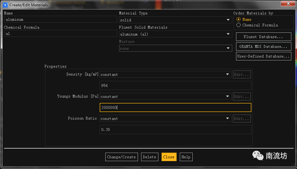 单击主菜单中Physics→Materials→Create/Edit,弹出Create/Edit Materials(材料)对话框。修改铝的参数。
