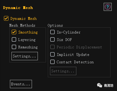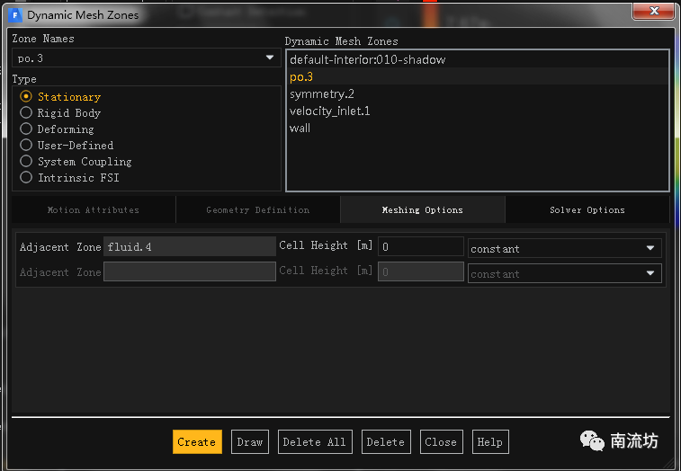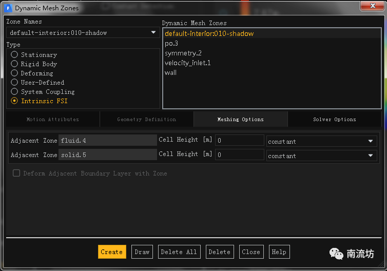 (3)设置动网格区域。设置出入口,外边界及对称轴为固定区域,流图区域接触面为Intrinsic FSI。