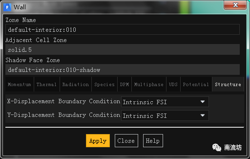 (2)双击default-interior:010弹出边界条件设置对话框。设置边界位移边界条件为Intrinsic FSI,单击OK按钮确认退出。