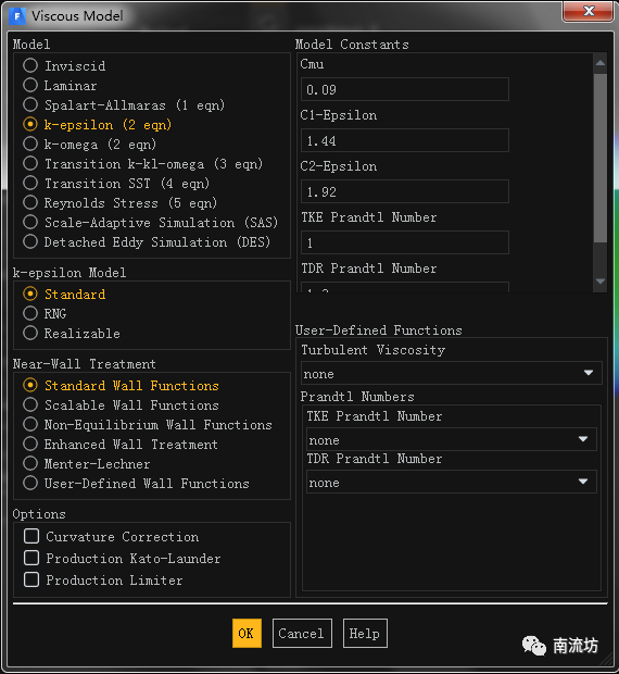 在模型设定面板Models中双击Viscous按钮,弹出Viscous Models对话框,勾选Standard k-epsilon模型。