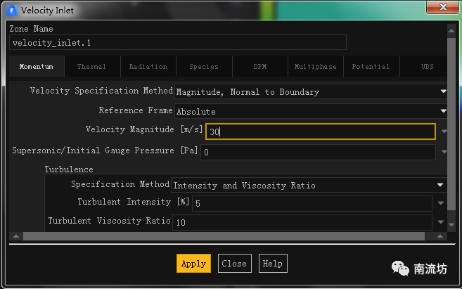 在边界条件面板中,双击velocity_inlet.1弹出边界条件设置对话框。VelocityMagnitude输入30,单击OK按钮确认退出。