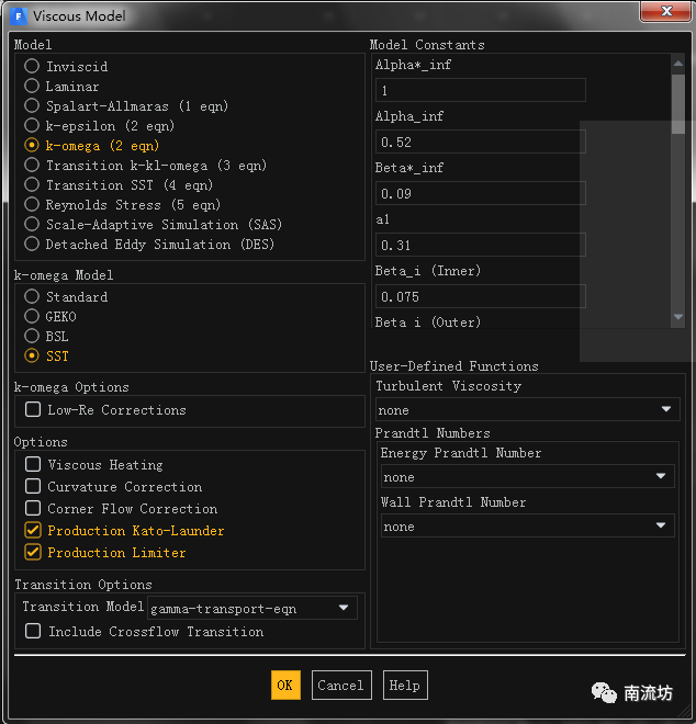 在模型设定面板Models中双击Viscous按钮,弹出Viscous Models对话框,勾选SST k-omega模型。