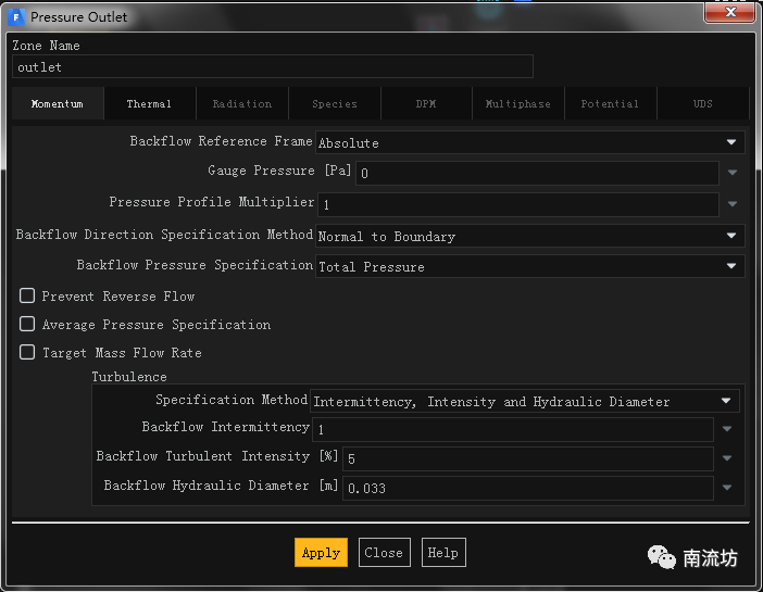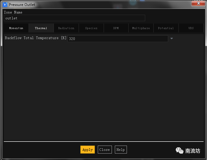 (2)在边界条件面板中,双击设置outlet的边界条件设置对话框。设置Gauge Pressure为0,Temperature设置为320,单击OK按钮确认退出。