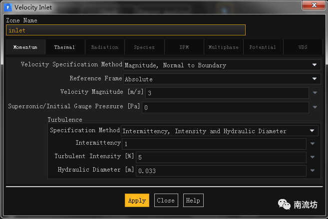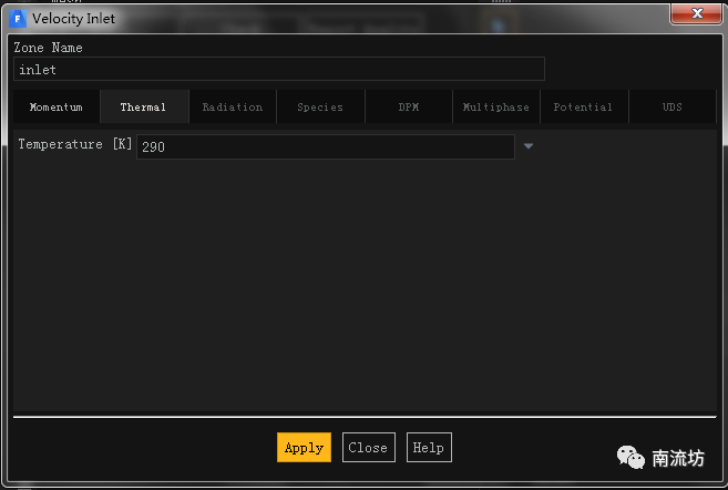 (1)在边界条件面板中,双击inlet弹出边界条件设置对话框。Velocity Magnitude输入3,Temperature设置为290,单击OK按钮确认退出。