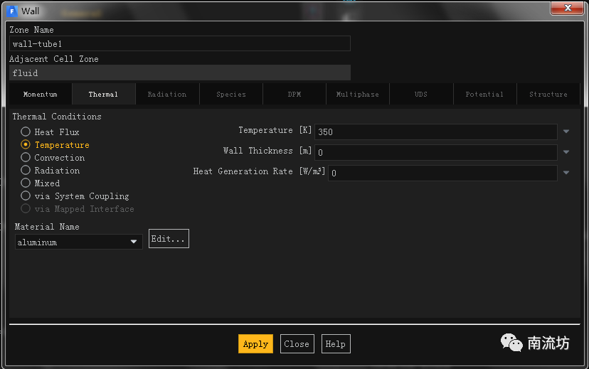 (3)在边界条件面板中,双击设置wall-tube1的边界条件设置对话框。Thermal Condition设置为Temperature,Temperature设置为350,单击OK按钮确认退出。