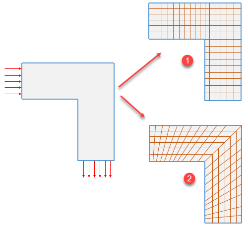 对于图中的流体域模型,如果划分四边形网格的话,通常有如图所示的两种方案。但是就流体流动来讲,由于流动方向在拐角处存在90°转变,因此网格2是符合流动方向的。