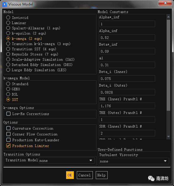 在模型设定面板Models中双击Viscous按钮,弹出Viscous Models对话框,在Model中选择SST k-omega,单击OK按钮确认。