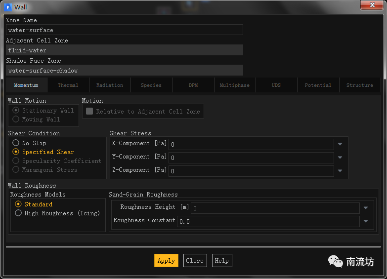 (4)设置water-surface边界条件类型为wall。Shear Condition设置为Specified Shear,单击Apply按钮确认退出。
