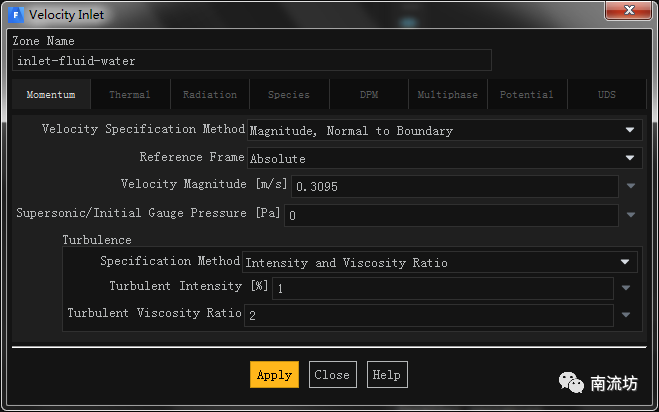 (2)双击inlet-fluid-water弹出边界条件设置对话框。Velocity Magnitude输入0.3095,单击Apply按钮确认退出。