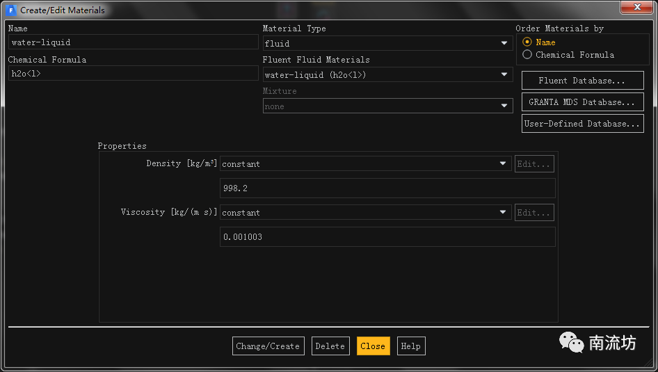 (2)单击主菜单中Setting Up Physics→Materials→Create/Edit,弹出Create/Edit Materials(材料)对话框。单击Fluent Database按钮弹出Fluent Database Materials对话框,选择water-liquid,单击Copy按钮确认。