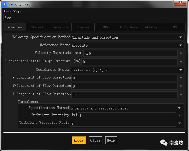 (3)设置top边界条件类型为Velocity Inlet。Velocity Magnitude输入4.5,单击Apply按钮确认退出。