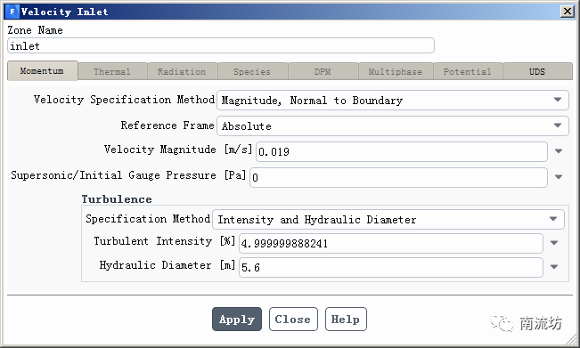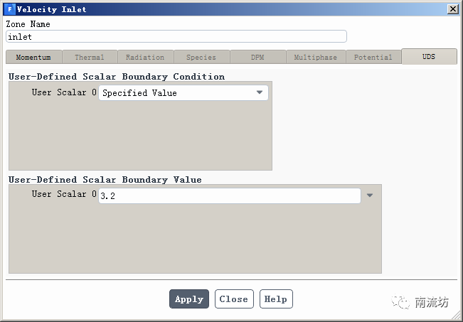 (1)在边界条件面板中,设置inlet,Velocity Magnitude输入0.019,User Scalar 0设置为3.2。
