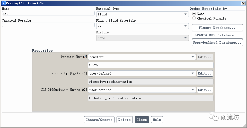 (1)单击主菜单中Setting Up Physics→Materials→Create/Edit,弹出Create/Edit Materials(材料)对话框。设置Viscosity和UDS Diffusivity为user-defned。