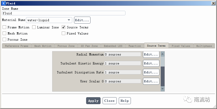 在设置计算域中,Material Name设置为water-liquid,勾选Source Terms。