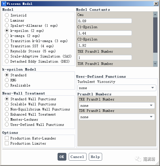 (1)在模型设定面板Models中双击Viscous按钮,弹出Viscous Models对话框,勾选k-epsilon模型。