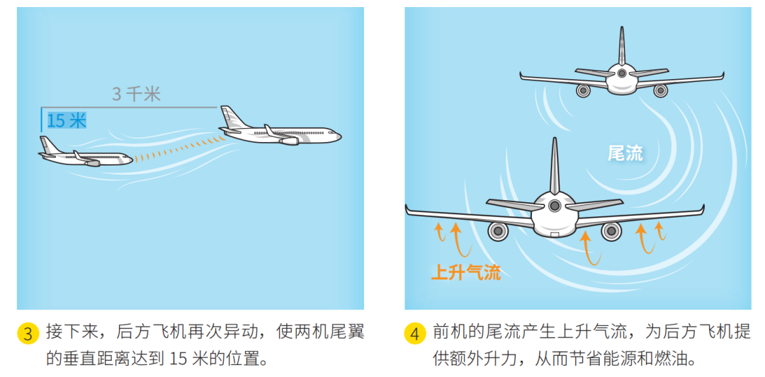 和鸟儿一样,机翼也会在飞机飞行时产生涡旋,带来上下翻动的气流。这些涡旋会向外旋转消散,在尾流周围形成上升气流。如果另一架飞机能够以特定距离跟上前机,那么尾流中心附近的上升气流就会为这架飞机提供额外的升力。借助这种升力, 后方飞机所需的推力就减少了,燃油成本和碳排放量也都减少了。