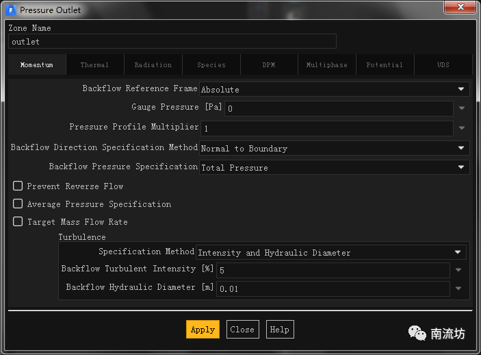 (2)双击outlet弹出边界条件设置对话框。保持默认值,单击OK按钮确认退出。