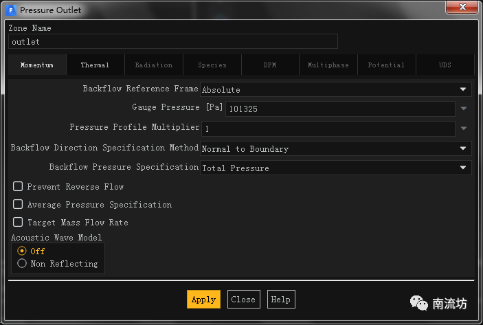 (2)双击outlet弹出边界条件设置对话框。Gauage Pressure输入101325。