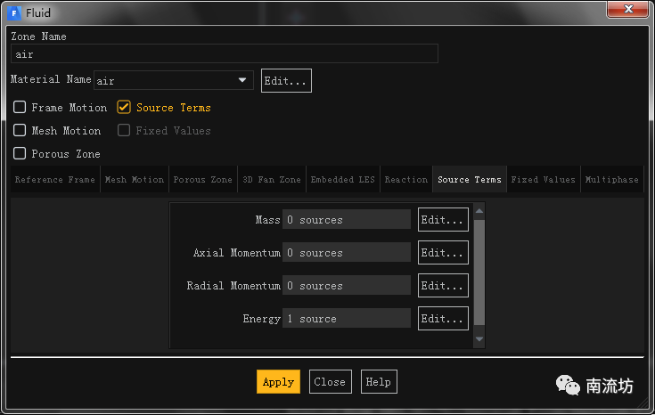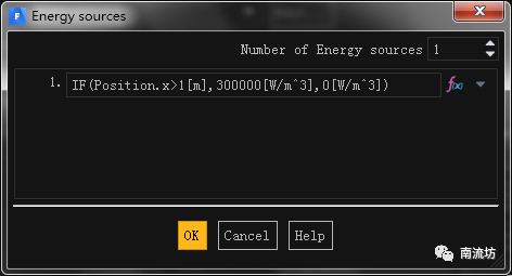 (2)双击air弹出计算域设置对话框。勾选Source Terms,单击Engery右侧Edit按钮弹出Engery Sources对话框,输入表达式IF(Position.x>1[m],300000[W/m^3],0[W/m^3])。