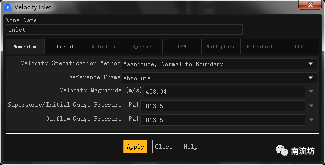 (1)在边界条件面板中,双击inlet弹出边界条件设置对话框。Velocity Magnitude输入408.34。
