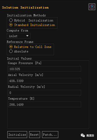 Initialization Methods中选择Standard Initialization,Compute from选择inlet,单击Initialize按钮进行初始化。
