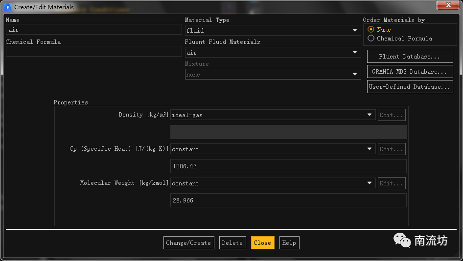 单击主菜单中Setting Up Physics→Materials→Create/Edit,弹出Create/Edit Materials(材料)对话框。设置Density为ideal-gas,单击Change/Create按钮确认。